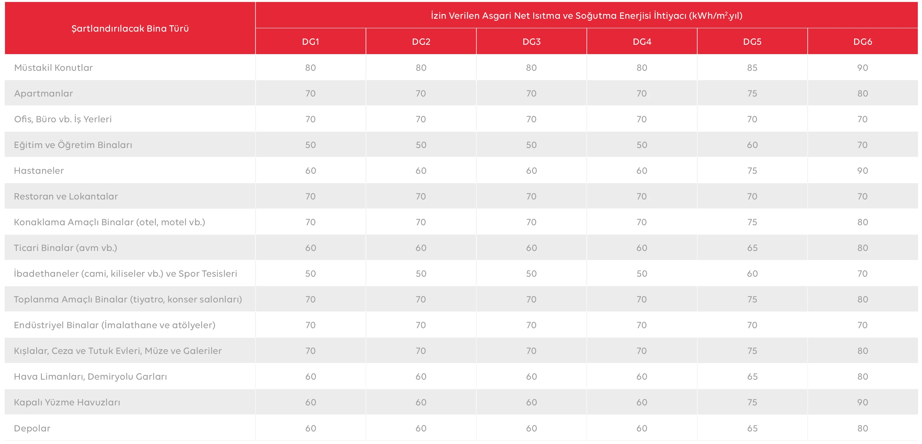 TS 825:2024 standardı, binaların yıllık net enerji ihtiyacını sınırlayarak enerji verimliliğini garanti altına almayı hedeflemektedir. Örneğin, apartmanlar için yıllık net enerji sınırı 70 kWh/m².yıl olarak tanımlanmıştır. Bu sınırlar, binanın kullanım amacı ve iklim bölgesine göre farklılık gösterir ve yapı bileşenlerinin ısıl performanslarından havalandırma sistemlerinin verimliliğine kadar pek çok faktörü içerecek şekilde tasarlanmıştır. Böylece hem ısıtma hem de soğutma yükleri optimize edilerek kullanıcı konforu artırılırken aynı zamanda işletme giderleri azaltılır. Bu limitler, TS 825:2024’ün Avrupa Birliği enerji verimliliği hedefleri ve “Neredeyse Sıfır Enerjili Bina (nSEB)” yaklaşımıyla uyumlu olarak geliştirilmiştir.