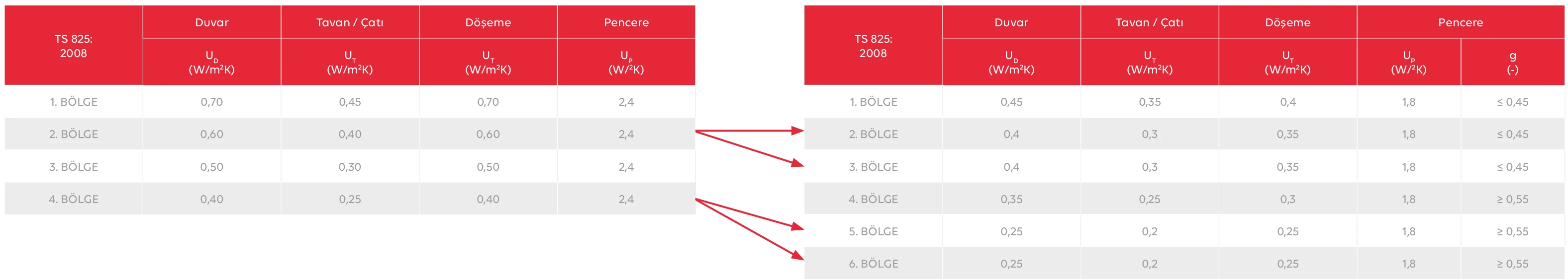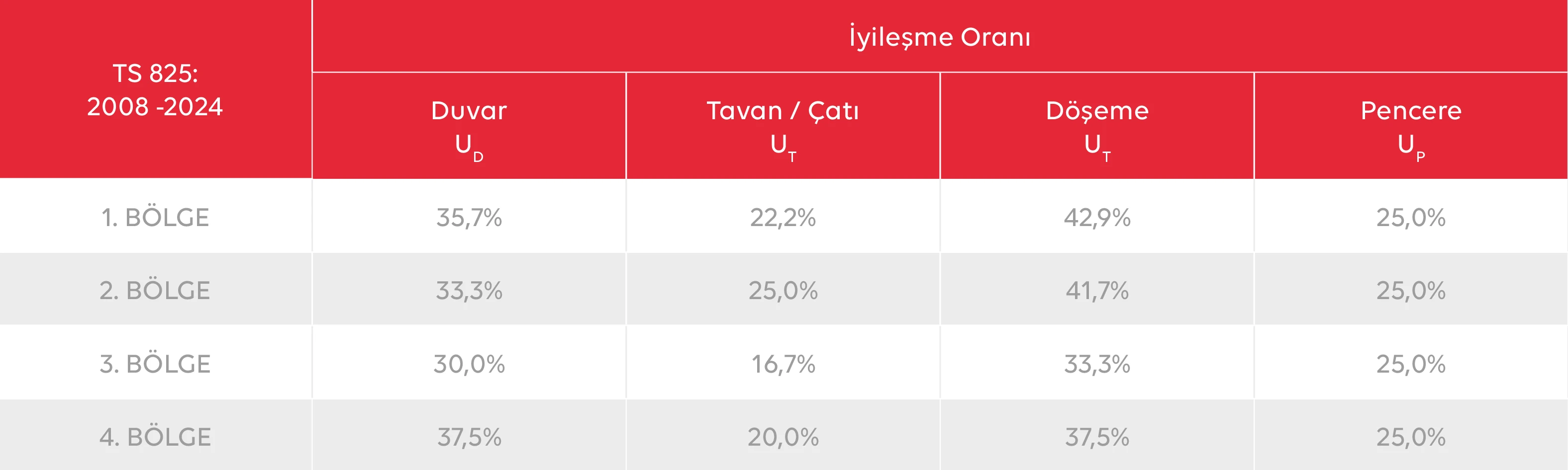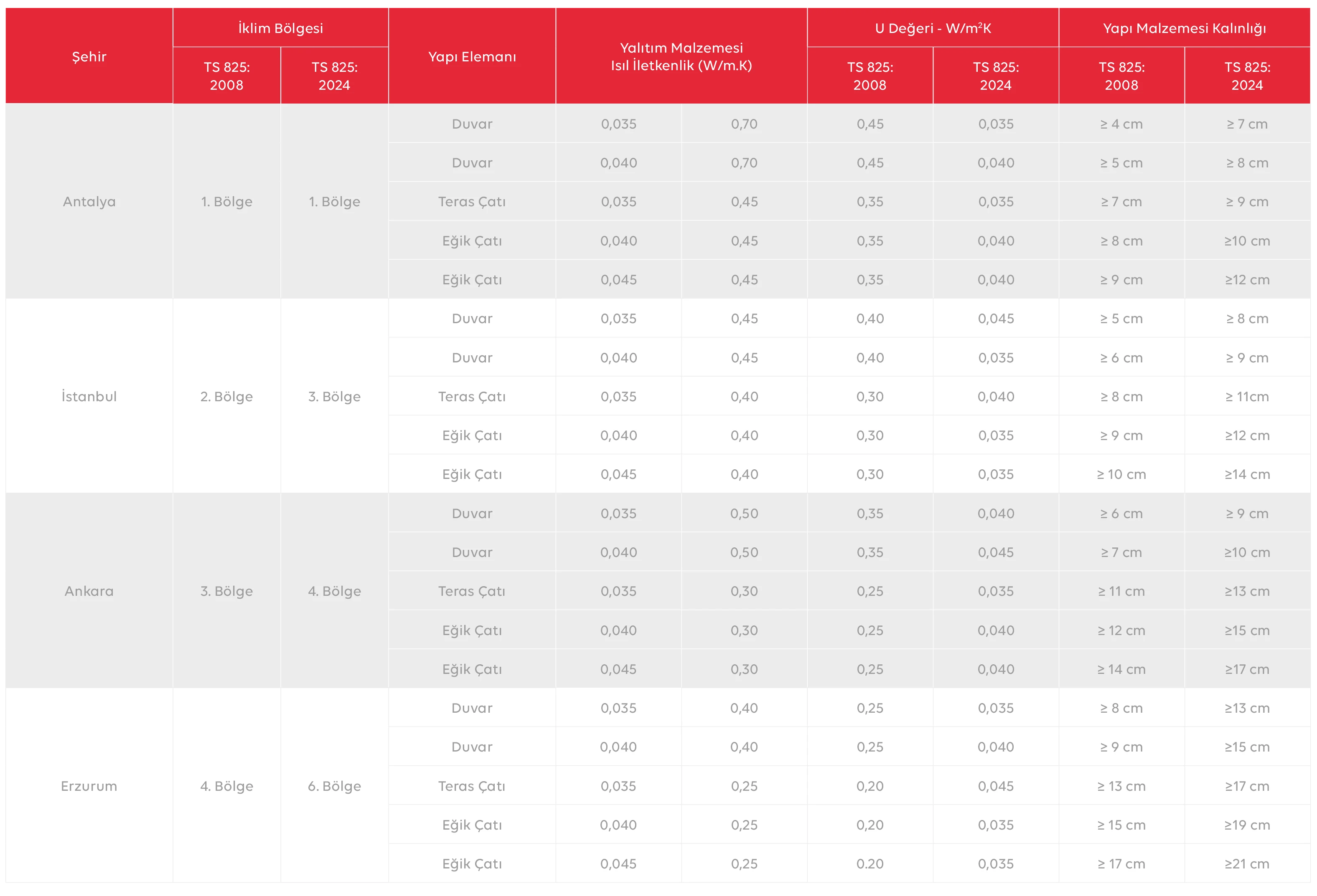 TS 825:2024 standardı, Türkiye’deki binaların enerji verimliliğini artırmak için yapı elemanlarının ısıl geçirgenlik katsayılarını (U değerlerini) önemli ölçüde düşürmüştür. Örneğin, 1. bölgedeki duvarlar için U değeri 0,45 W/m²K’den 0,34 W/m²K’ye indirilmiştir. Çatı, döşeme ve pencere gibi diğer yapı elemanlarında da benzer oranlarda iyileştirmeler yapılmıştır.
