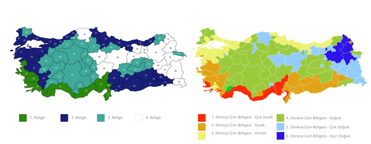 TS 825 standardında Türkiye’nin iklim bölgeleri 6 ana bölge olarak tanımlanmıştır. Her bölge için önerilen U değerleri ve yalıtım kalınlıkları farklılık gösterir. Harita üzerinden seçtiğiniz ilin değerlerine ulaşabilirsiniz.